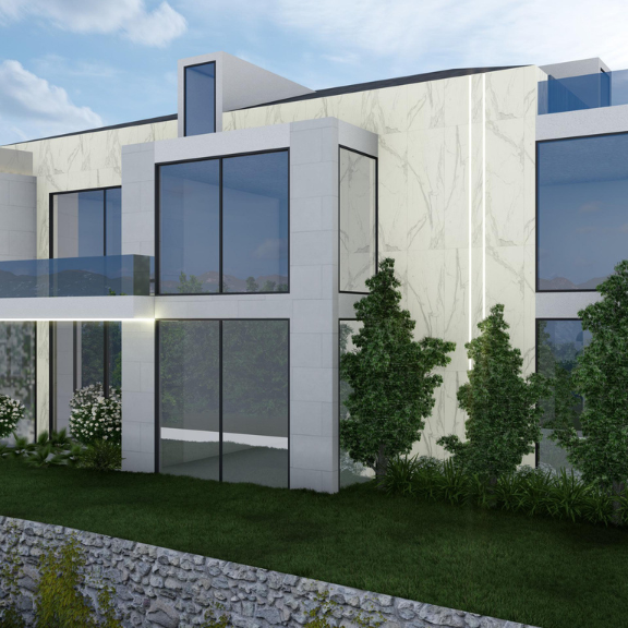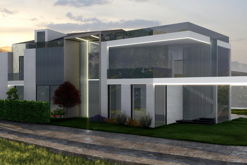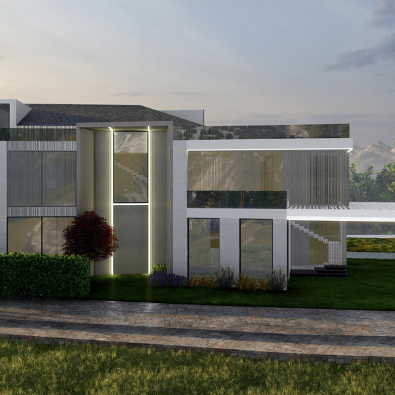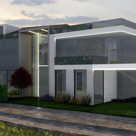 BH Villa is designed as a contemporary residence where clean lines and refined materiality define the architectural language. Expansive glazing and marble-clad surfaces shape a sense of openness and continuity, while the surrounding landscape is carefully integrated to enhance the overall spatial experience and connection between interior and exterior.