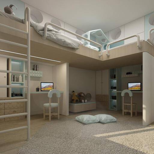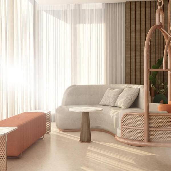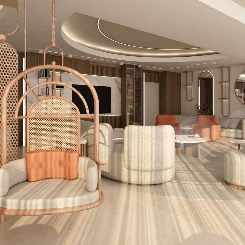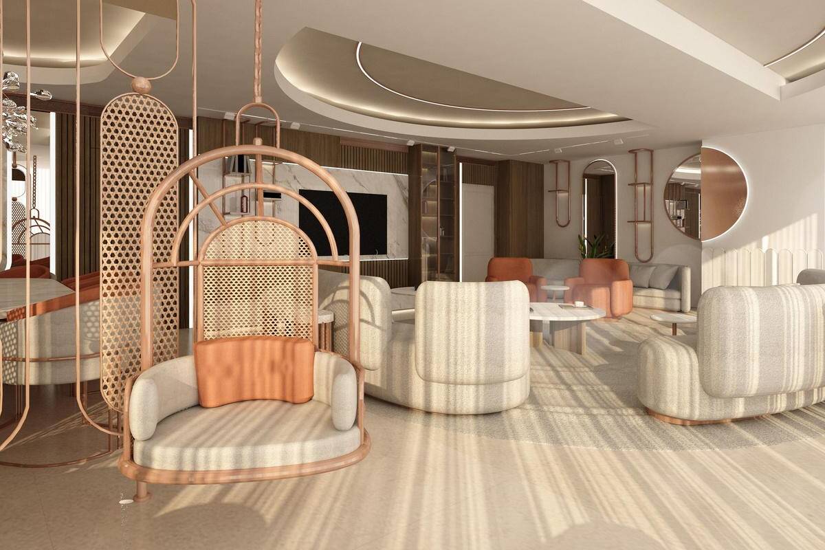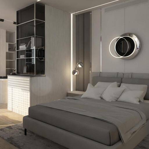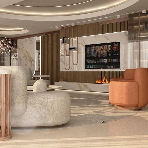 This apartment is designed as a light and airy interior where curved forms define both the furnishings and architectural details. Circular ceiling elements and subtle, layered lighting complement a soft palette of creams and light coral, creating a flowing, harmonious, and inviting living environment.