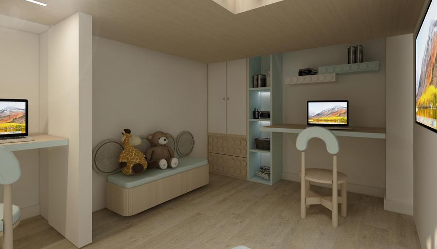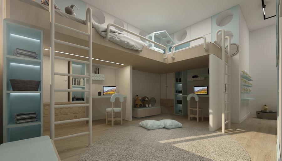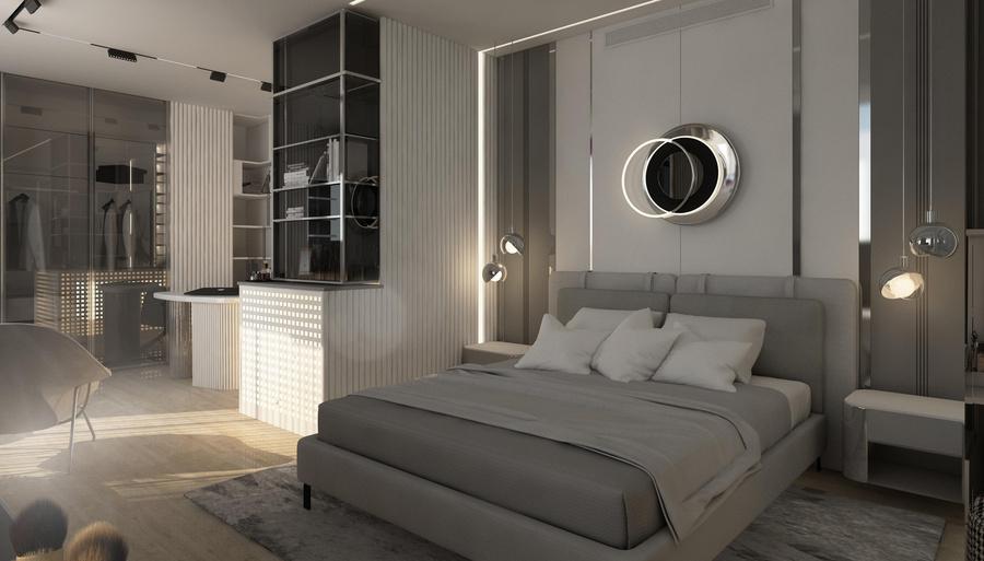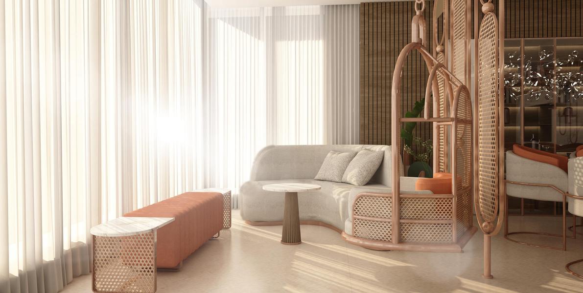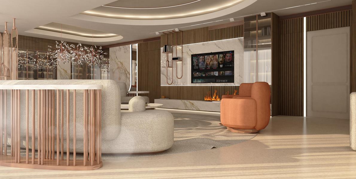 This apartment is designed as a light and airy interior where curved forms define both the furnishings and architectural details. Circular ceiling elements and subtle, layered lighting complement a soft palette of creams and light coral, creating a flowing, harmonious, and inviting living environment.