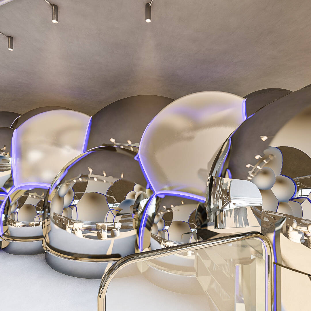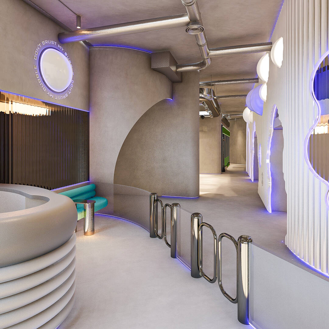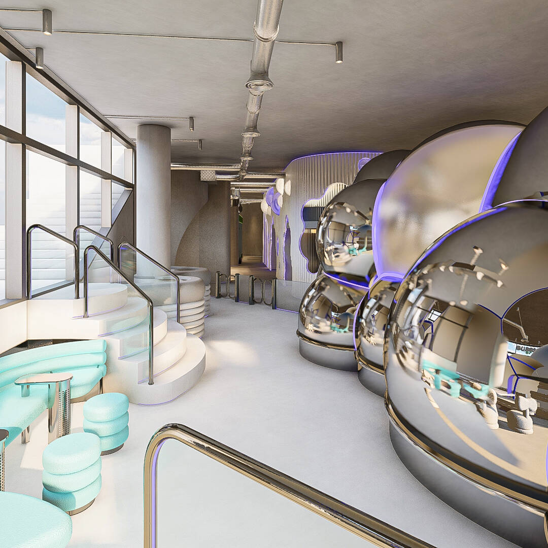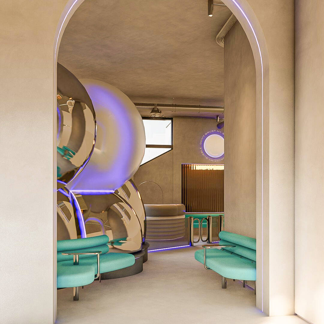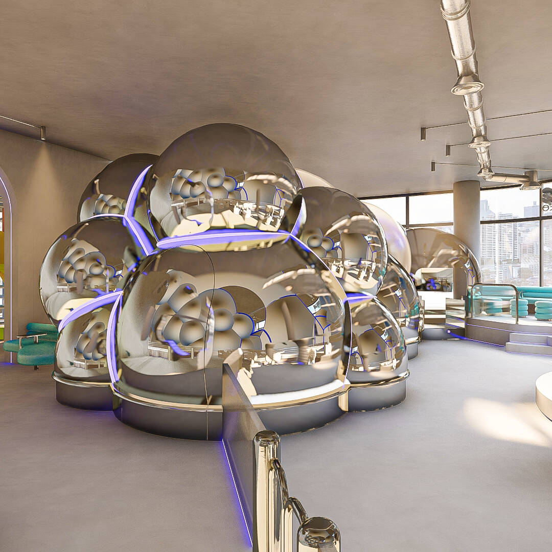 Bubble Gate is designed as an immersive indoor playground where a monumental mirrored bubble anchors the space. Play areas, interactive zones, and vibrant experiences unfold around it, while the LED-lit interior of the bubble creates a striking and celebratory focal point.