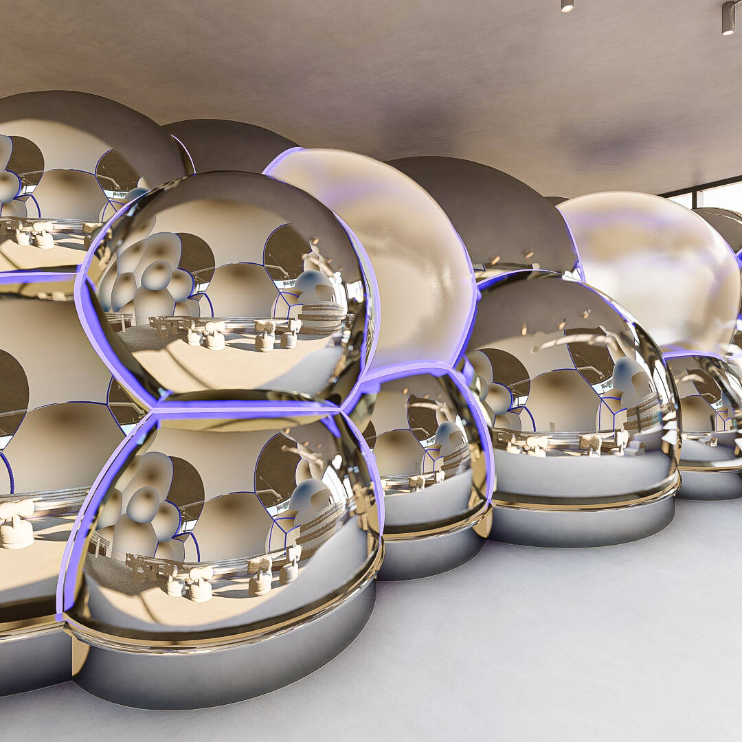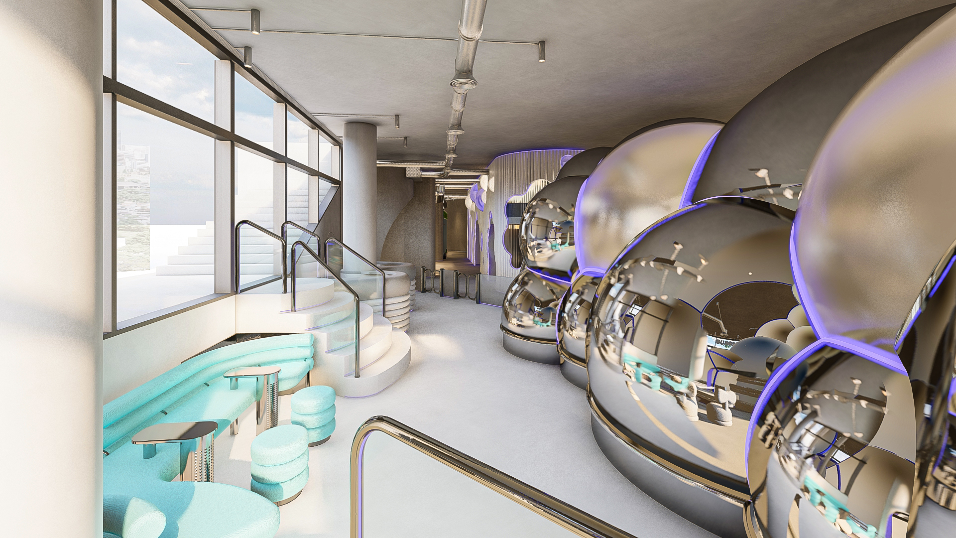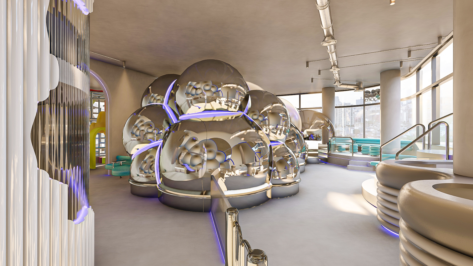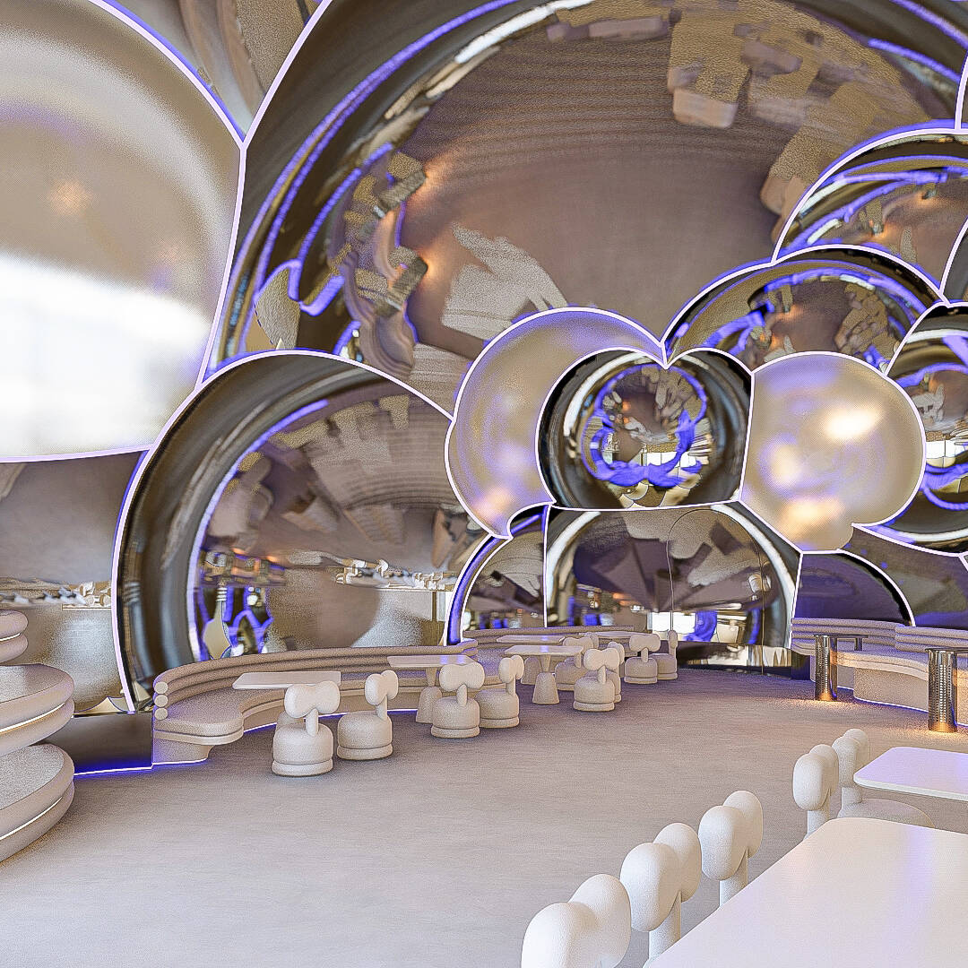 Bubble Gate is designed as an immersive indoor playground where a monumental mirrored bubble anchors the space. Play areas, interactive zones, and vibrant experiences unfold around it, while the LED-lit interior of the bubble creates a striking and celebratory focal point.