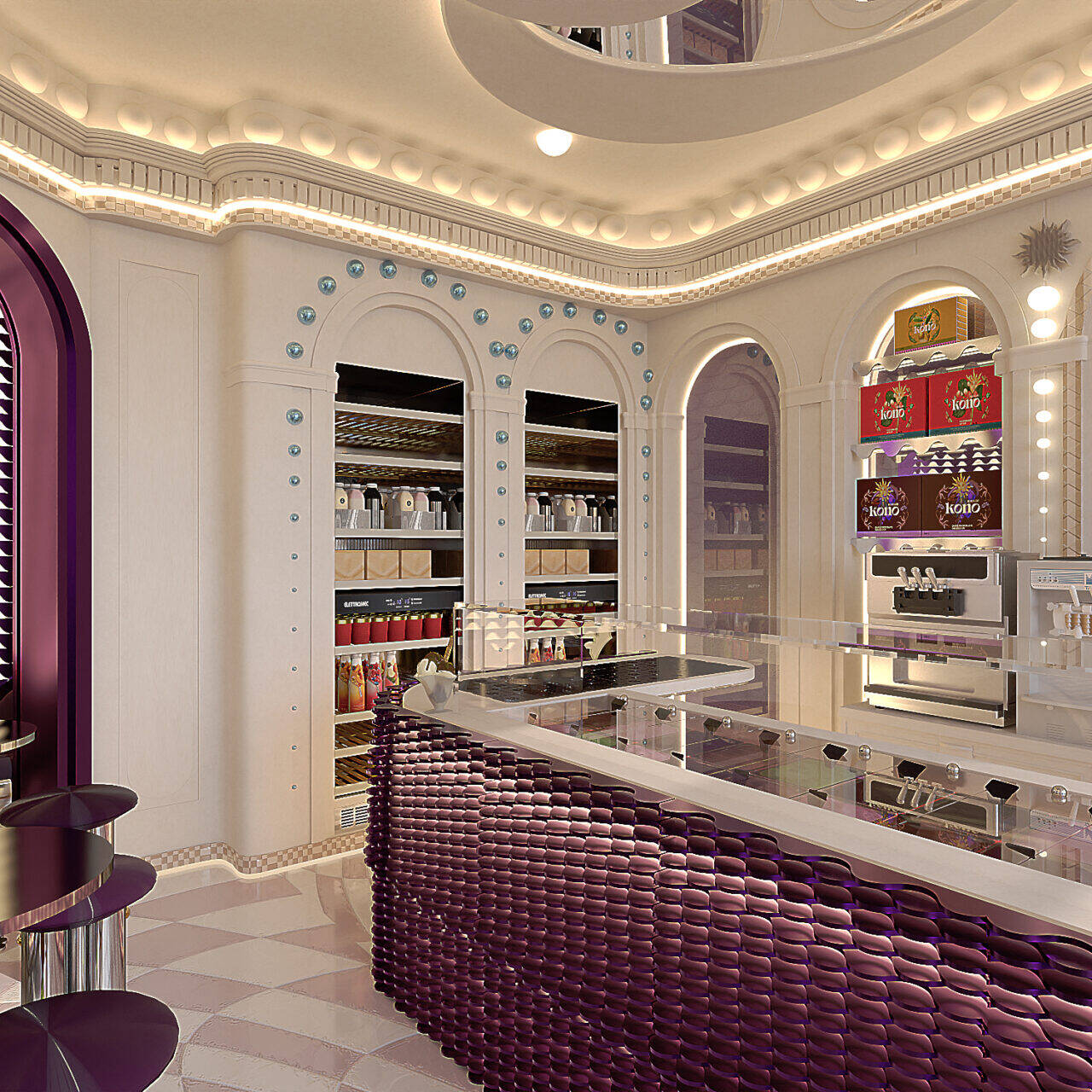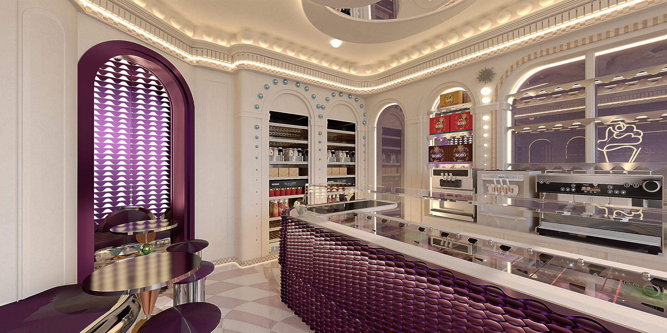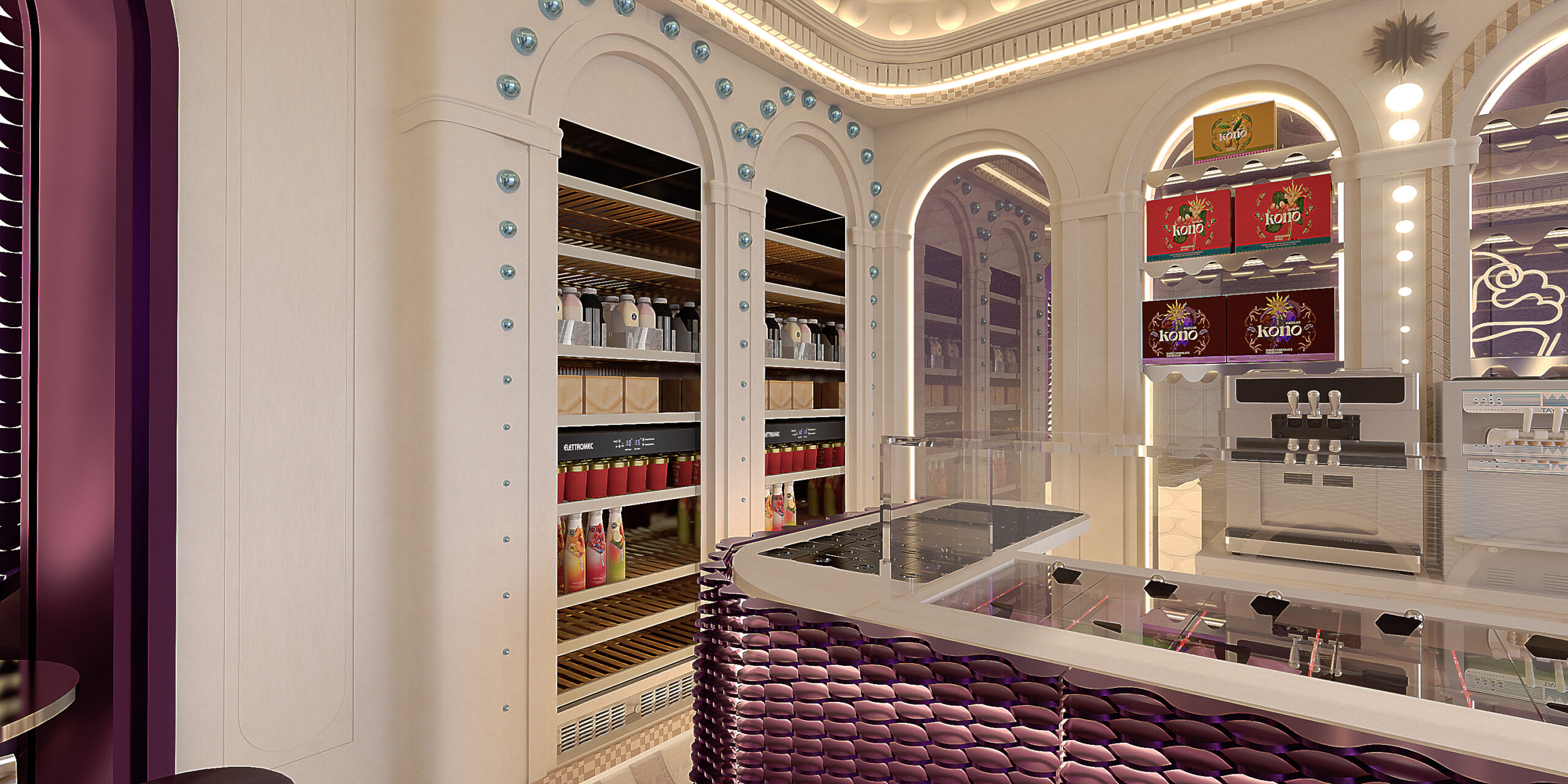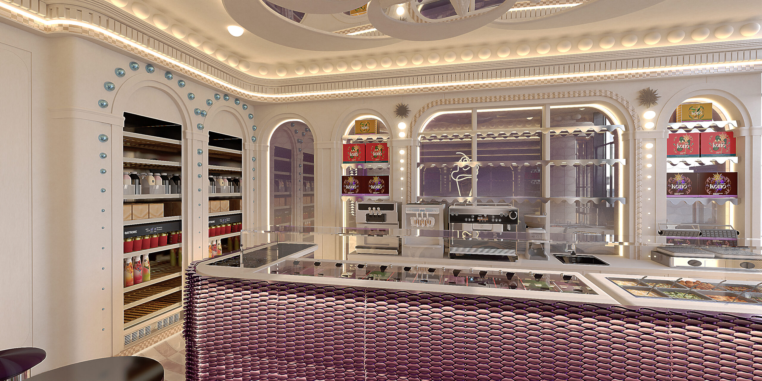 KONO KONO Year2026 Services Interior Design Kono is a gelato concept in Beirut with a contemporary interior that feels fun and inviting. Clean lines, thoughtful spatial planning, and subtle pops of color create a welcoming environment that reflects the brand’s approachable personality. 3D VISUALIZATION PrevNext
