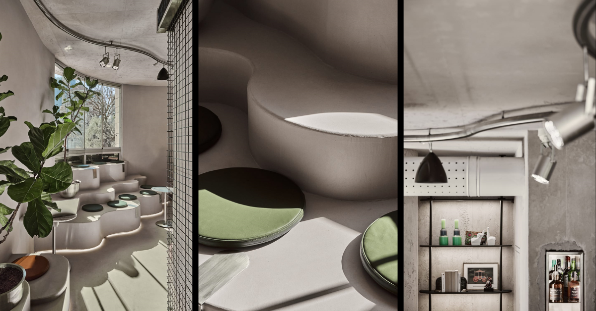 At Roff, neocement doesn’t just cover the surfaces — it builds them. The walls, the floor, and the entire tiered seating structure that defines the window zone are all formed from the same material, in the same pale cool grey, continuous and unbroken. The seating is not furniture placed on a neocement floor. The seating is neocement — organic, wave-form volumes that emerge from the ground plane as if the space grew them. There is no visual interruption between what you sit on and what surrounds you.