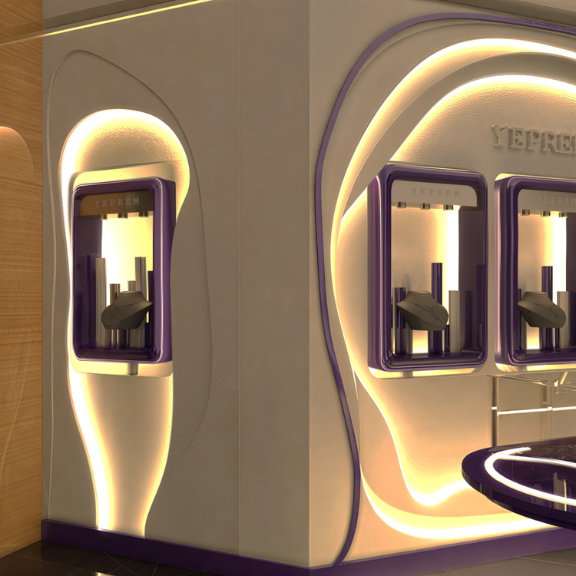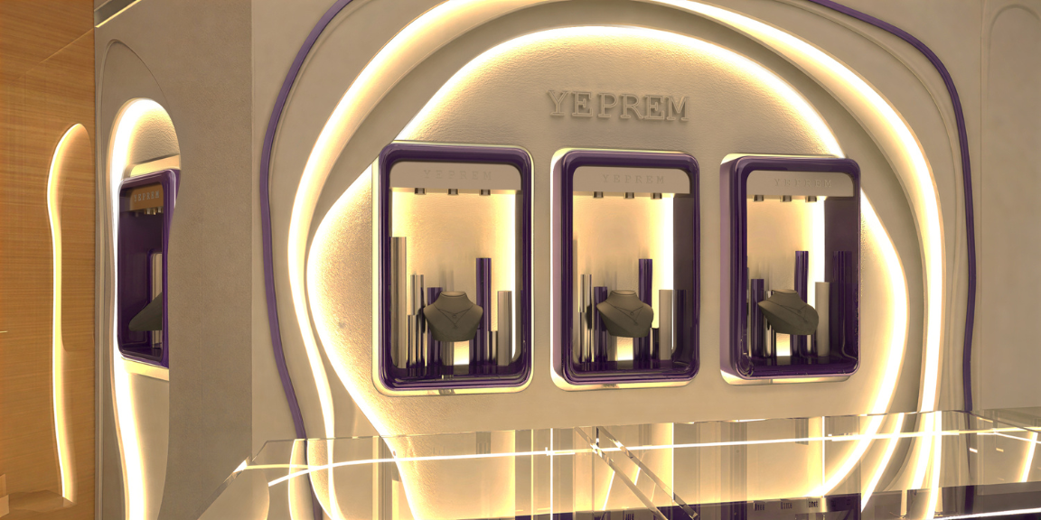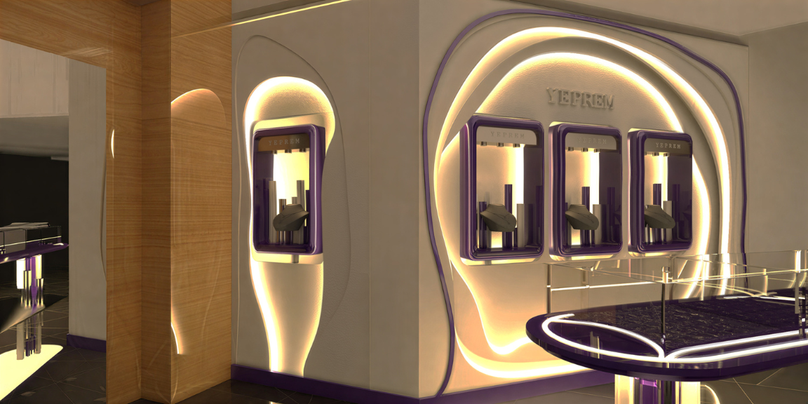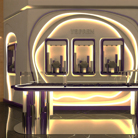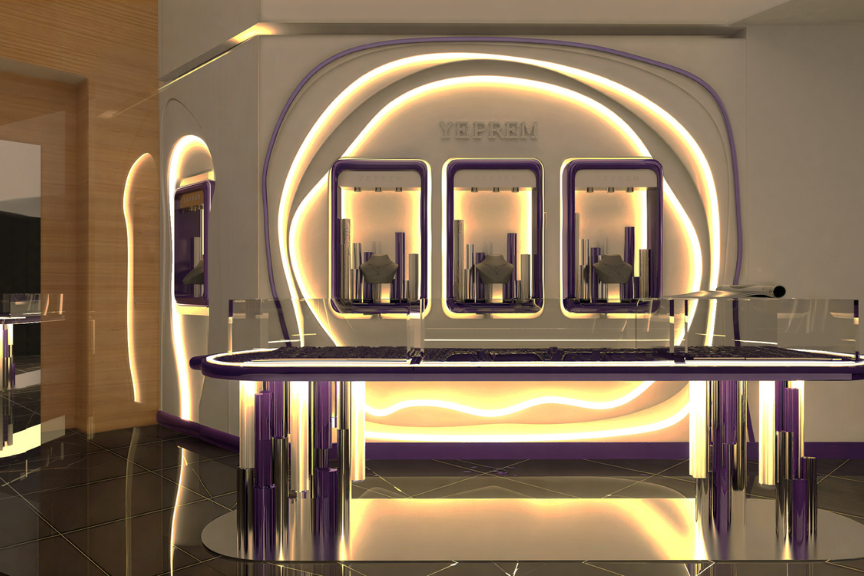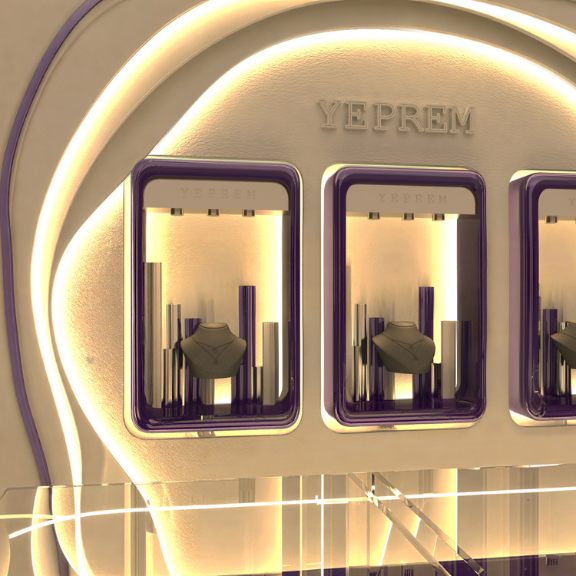 Designed as a standalone object within a larger retail context, the Yeprem kiosk translates the brand’s identity into a sculptural, highly controlled form. Clean lines and precise detailing, create a refined backdrop that enhances the brilliance and intricacy of the jewelry. The result is a compact yet impactful spatial statement.